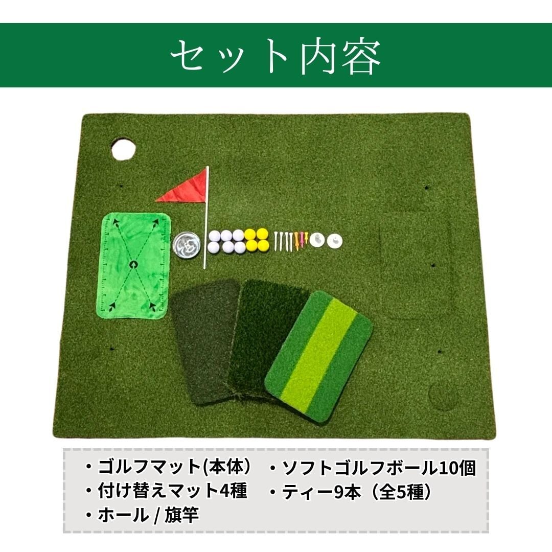 自宅やオフィス、ゴルフ練習場での本格的なスイング練習を可能にする、プロ仕様の大型ゴルフマットセットです。120cm×150cmの広さと高いクッション性により、打撃時の振動や音を軽減し、周囲への配慮も万全。最大の特長は、用途に応じて交換できる4種類の打撃マット。スイング跡が残るマットでミスショットを可視化でき、ラフやフェアウェイの再現もできるため、より実践的な練習が可能です。セットにはティーや練習球、ホールカップ、旗竿まで揃っており、届いたその日からすぐに練習を始められます。ゴルフのレベルアップを目指すすべての方へおすすめの一台です。