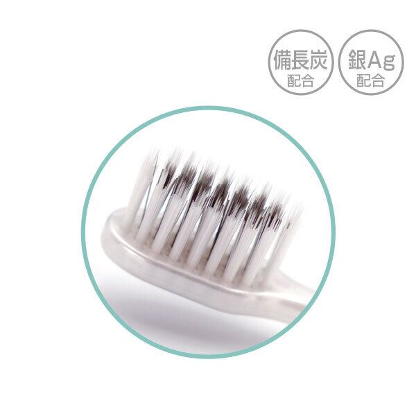 歯周ケアと磨き心地の双方を追求した、新ブラッシングテクノロジーを採用。消臭・吸着作用などの効果があると知られている備長炭をブラシ毛に練り込み、白い部分には銀を配合。極細毛と普通毛の二重毛により歯と歯の隙間や歯周ポケットにブラシが入り込んで、しっかり磨くことができます。歯の汚れ、歯垢を落とし、口の中を爽やかにします。銀のパワーでブラシ毛を常に清潔に保ちます。毛先開きや摩耗が少ない毛質(ポリプチレンテレフタレート)、口中の奥まで届くコンパクトヘッド、手になじみやすいストレートハンドルを採用。